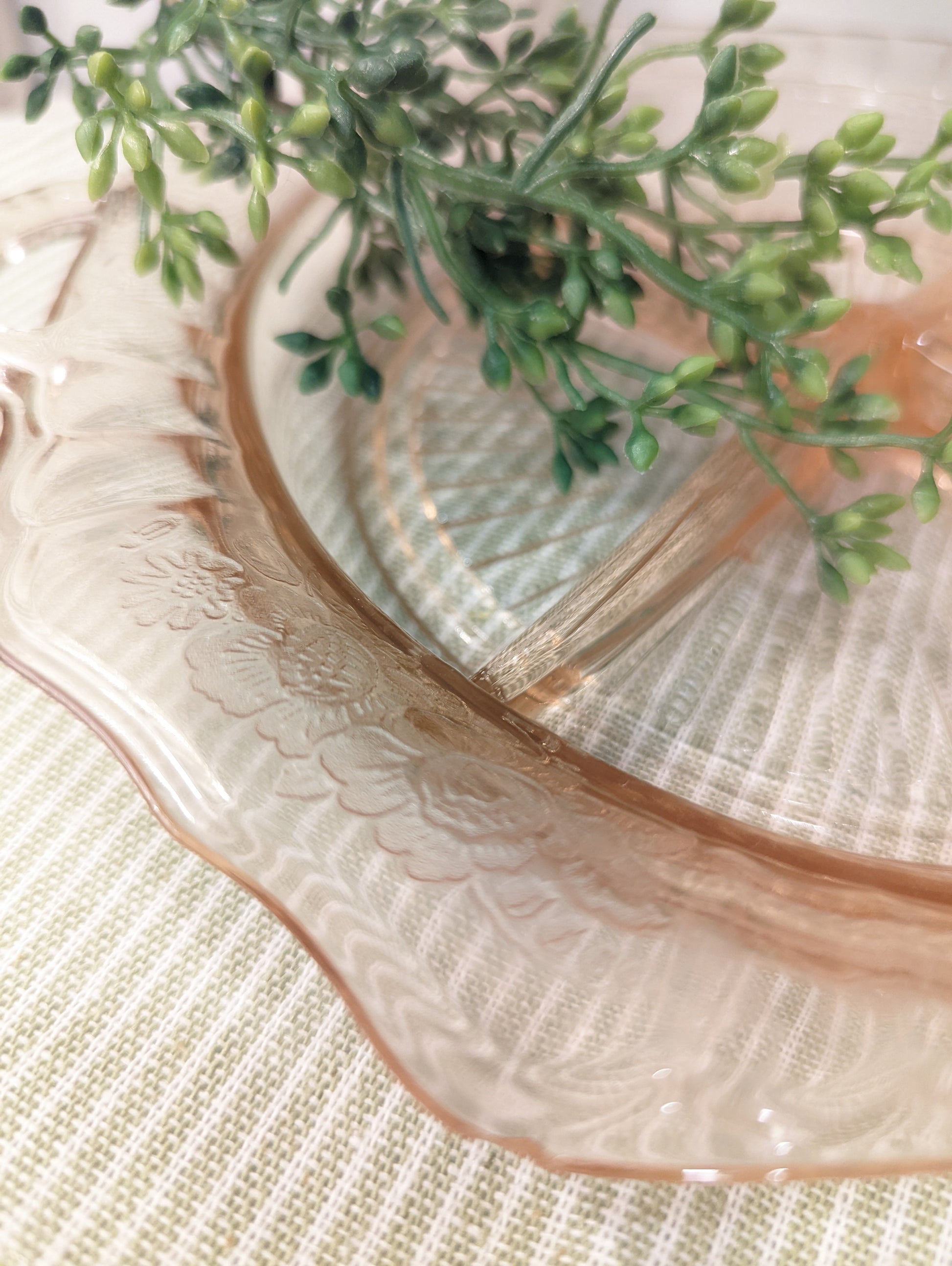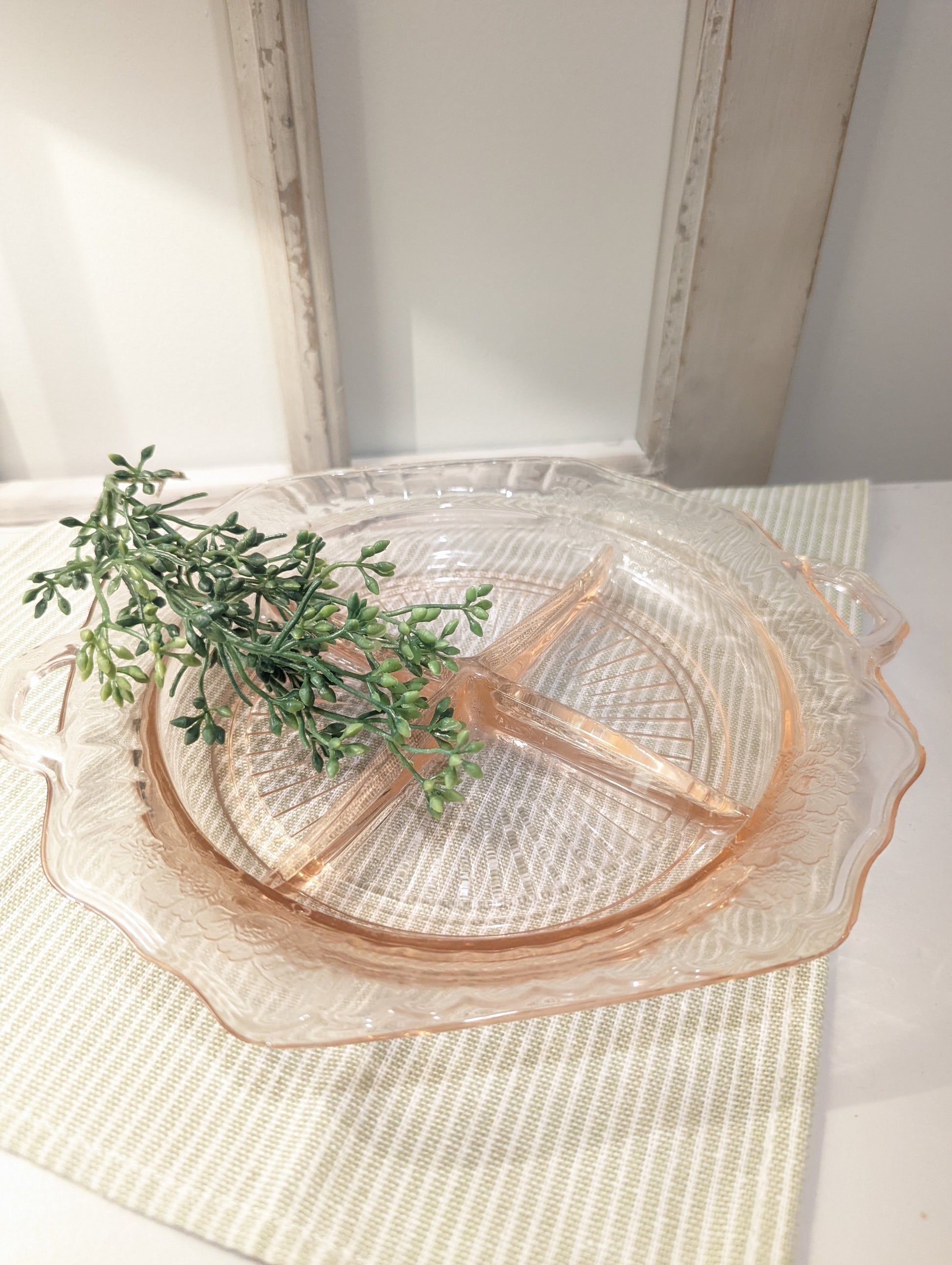 Vintage Mayfair Pink Depression Glass 4-Sectioned Relish Dish with etched flowers, pattern "Open Rose"
